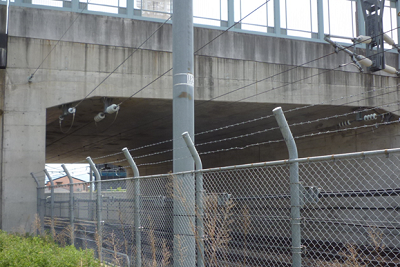 コンクリートの劣化により、コンクリート破片(塊)が落ちてこない様にメッシュシートを張り新幹線を守ります。